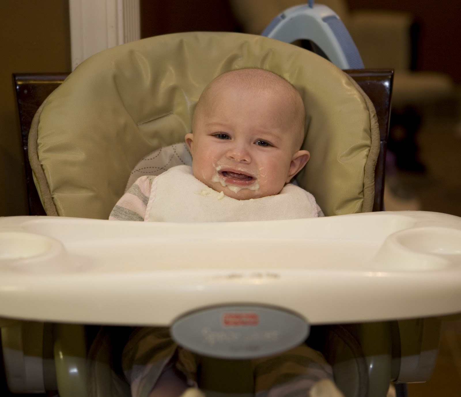 I know most babies start eating cereal around the 4 month mark...but my babies have just never been a fan of it this soon. I have always tried...but they don't normally take a liking to it till about 5 1/2 or 6 months for me. I tried to give some to Payton some a few weeks ago thinking she might like it and have some fun with it...wrong! Not interested at all...fussed and cried...until she finally got her bottle. But...I snapped some pics of her first experience with it anyway...just for memory's sake.